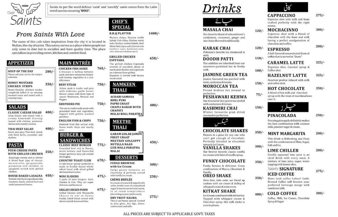 The menu at Cafe Saints is structured to offer a variety of options suitable for different times of the day, including breakfast, coffee breaks, and light meals. It features a range of beverages, breads, and sandwiches, allowing visitors to select items for quick orders or casual dining.
